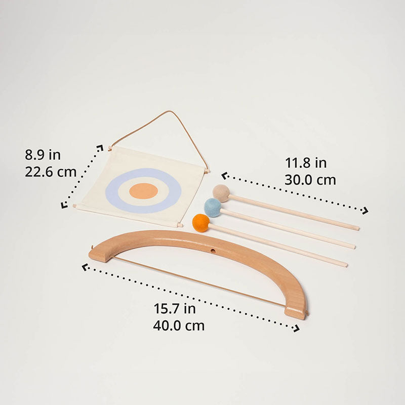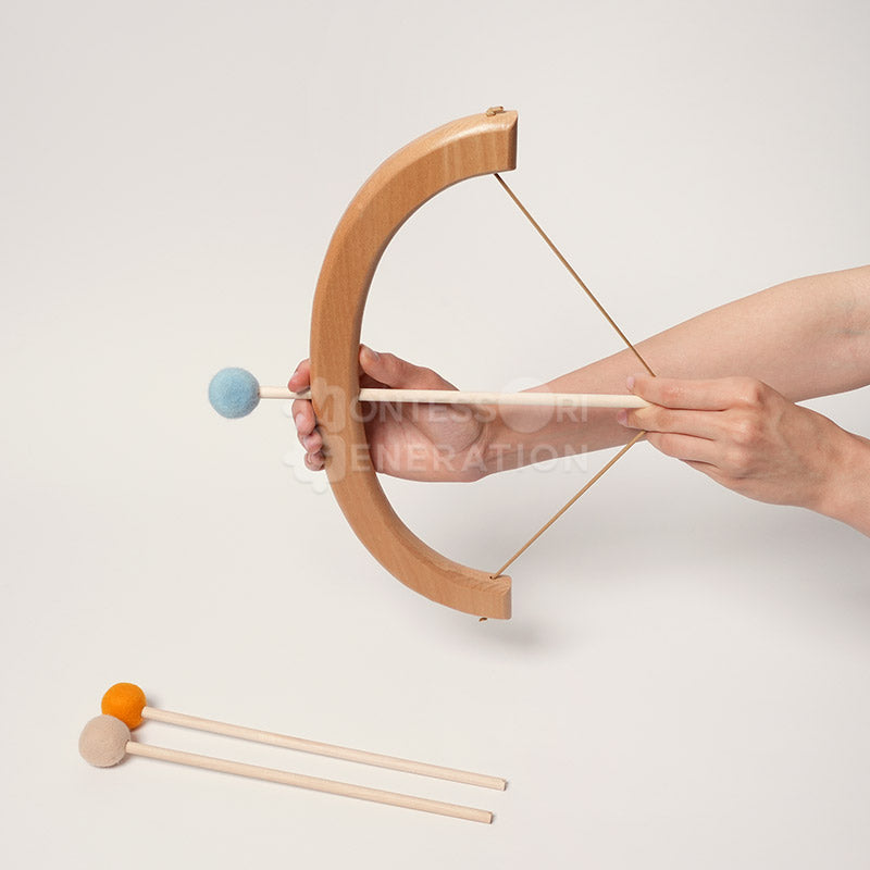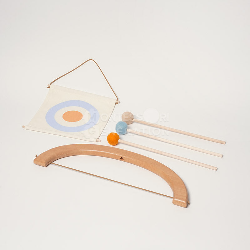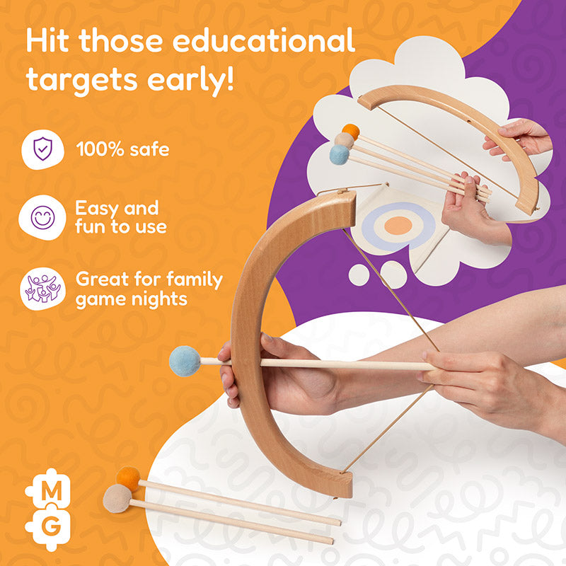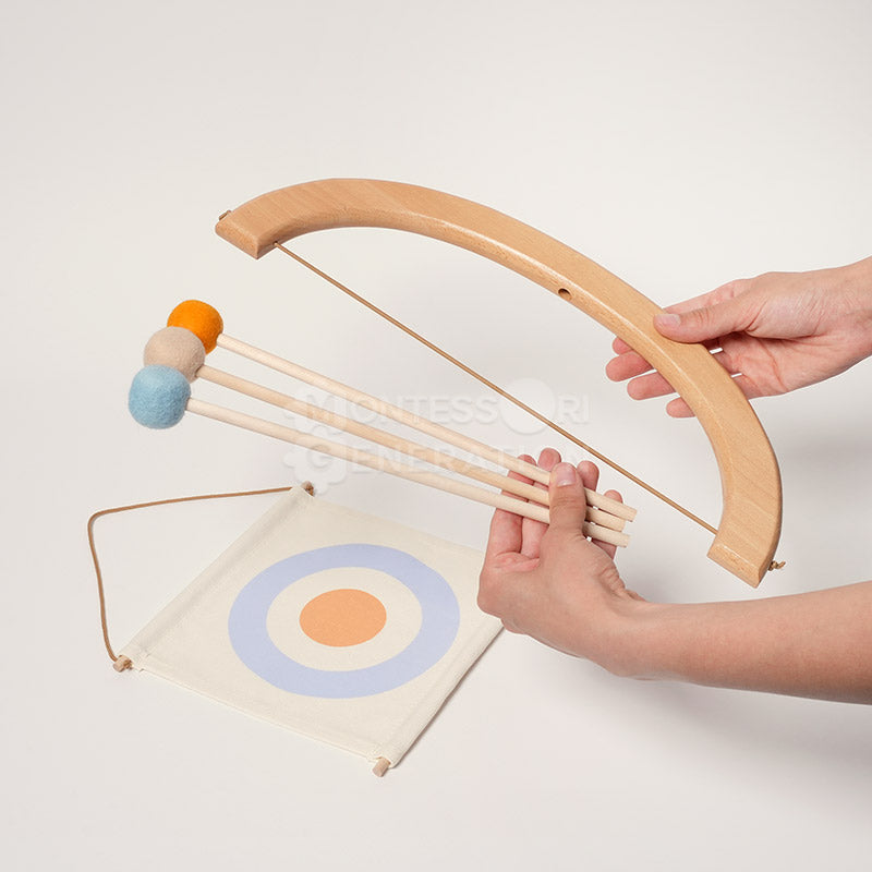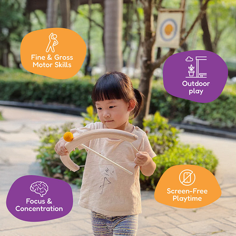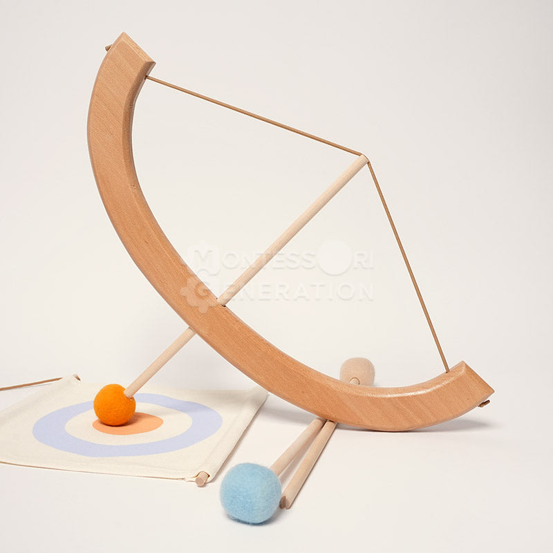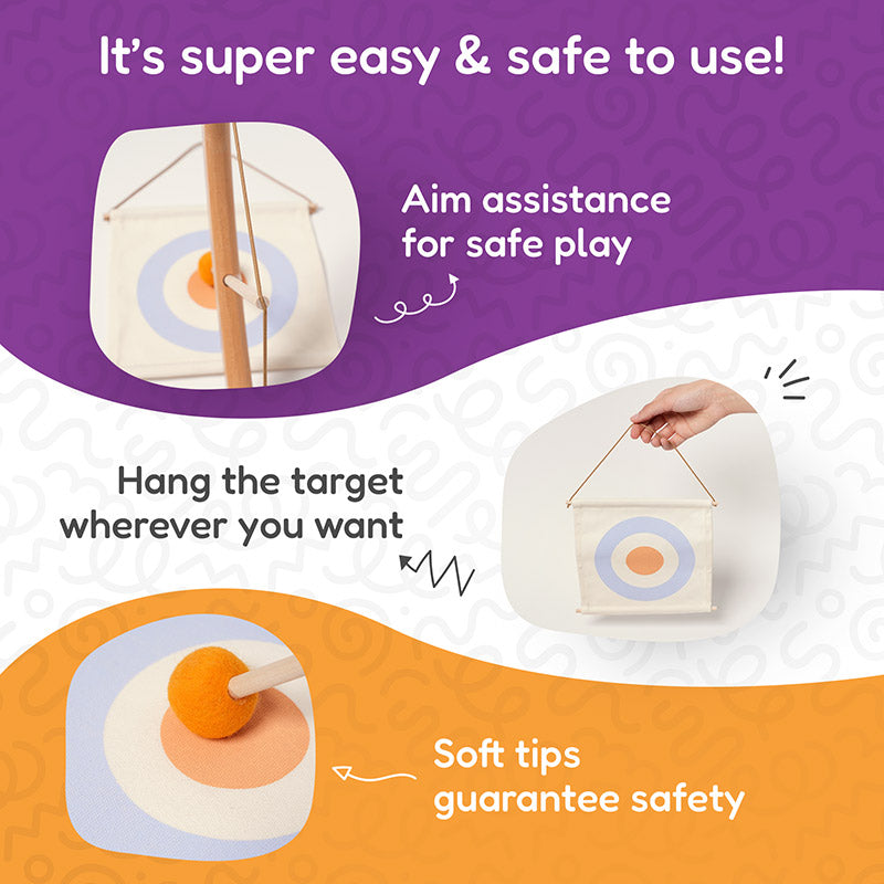 Arrow tips are actually soft pom-pom balls, so there’s no worrying about safety there. On the other hand, the whole set is made of nicely sanded wood, is smooth on the touch, and is perfectly safe for both kids and their environment (being eco-friendly and all that).