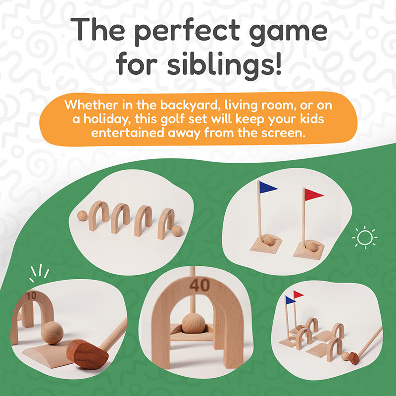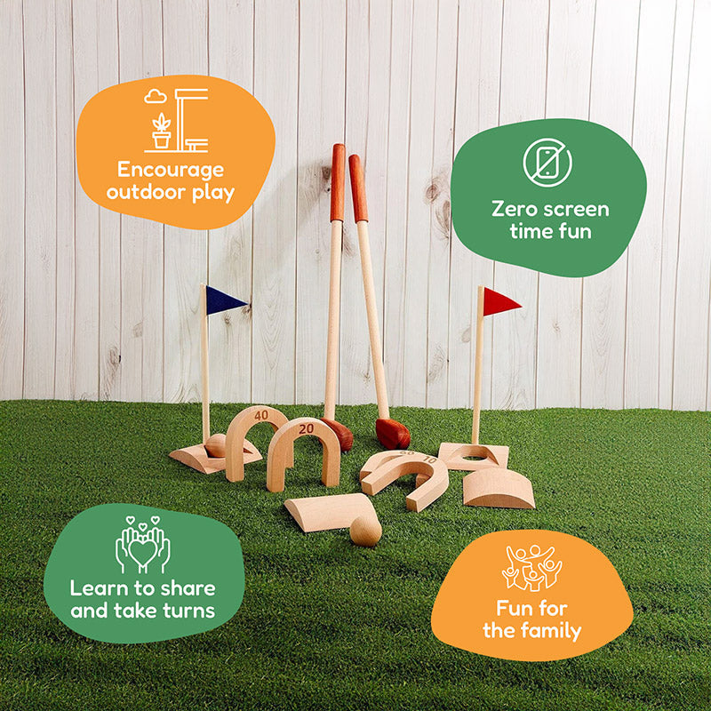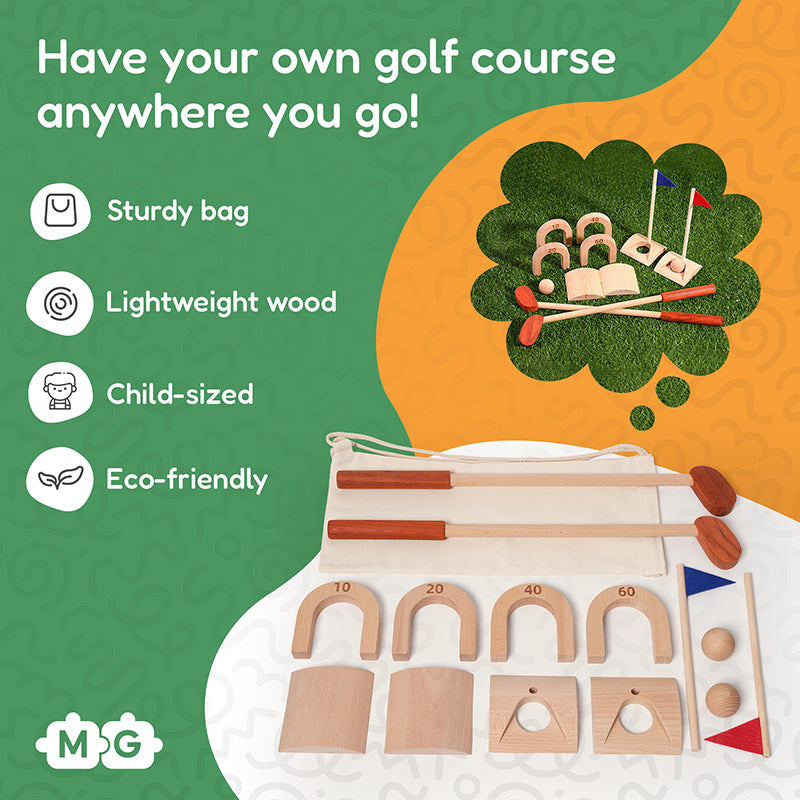 We used the best wood we could find for this Golf Set. It’s durable, sanded down to be perfectly smooth making it absolutely safe for your child. More than that, since it comes from a sustainable source, it’s also eco-friendly. Hooray!