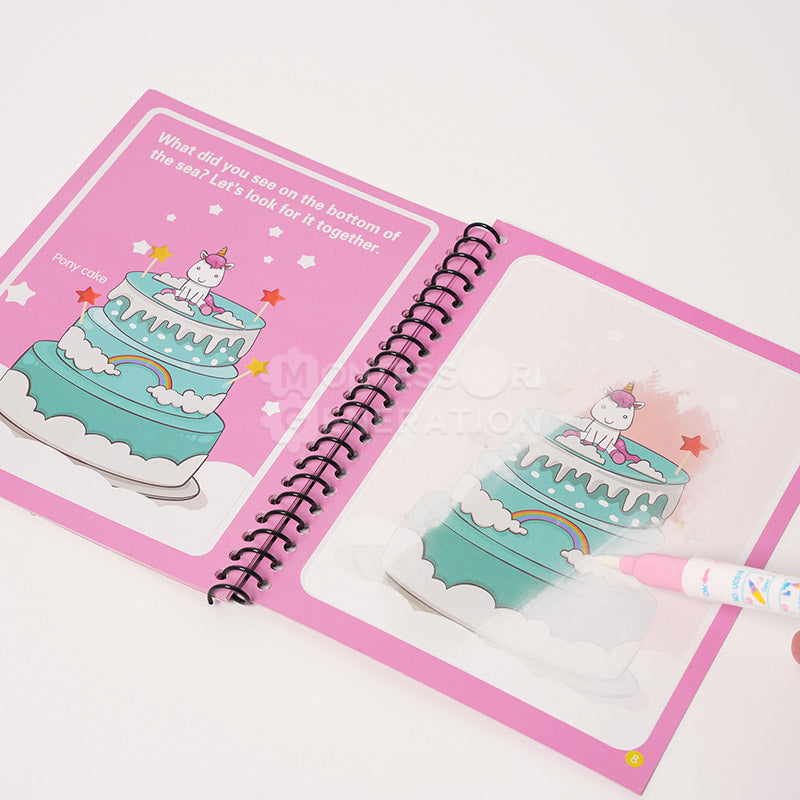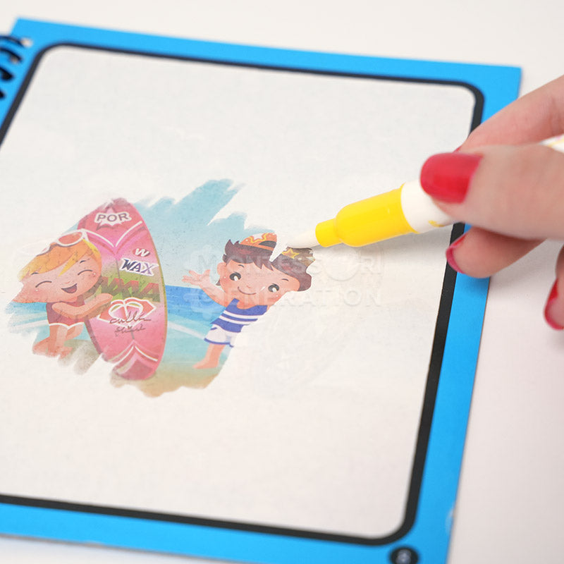 Once you color, the pictures are very vivid and colorful. As soon as they dry the colored areas disappear and the pages can be colored again and again.